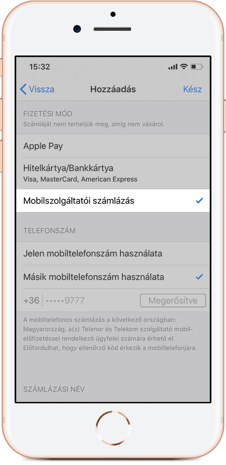 Válaszd ki a Mobilszolgáltatói számlázás lehetőséget és a Jelen mobiltelefonszám használatát, majd a Kész gombbal lépj tovább;