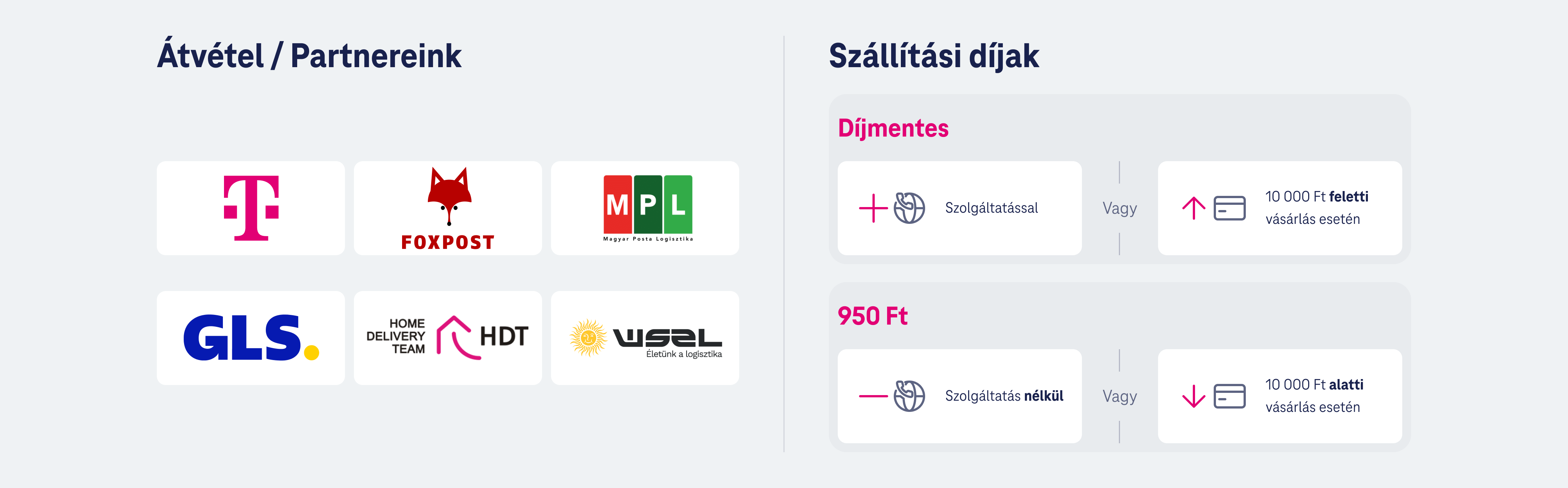 A rendelési folyamatban látod, hogy mik elérhetőek az aktuális tranzakció során számodra, mivel a kiajánlott szállítási módokat több tényező befolyásolja (pl. a termékek paraméterei, a kézbesítési cím, a rendelésben szereplő szolgáltatások és eszközei és biztonsági előírások is).
