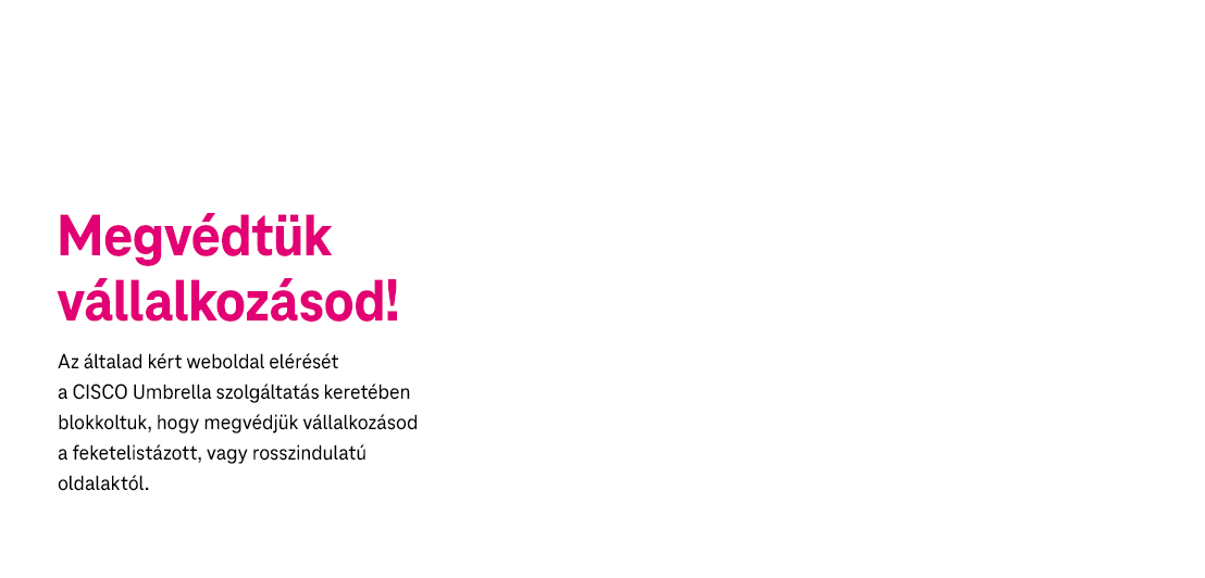 Ha a weboldalt ennek ellenére szeretnéd megnyitni, ahhoz a CISCO Umbrella szolgáltatást ki kell kikapcsolni, amit Te is megtehetsz a Telekom Appban az adott előfizetés SIM beállításai között - Fontos! Amennyiben a kiegészítő szolgáltatásoknál kapcsolod ki a CISCO Umbrellát, úgy magát a szolgáltatást mondod le! -, az Üzleti Önkiszolgáló Portálunkon, vagy kérheted kollégáink segítségét is telefonos ügyfélszolgálatunkon (1400) illetve üzleteinkben.